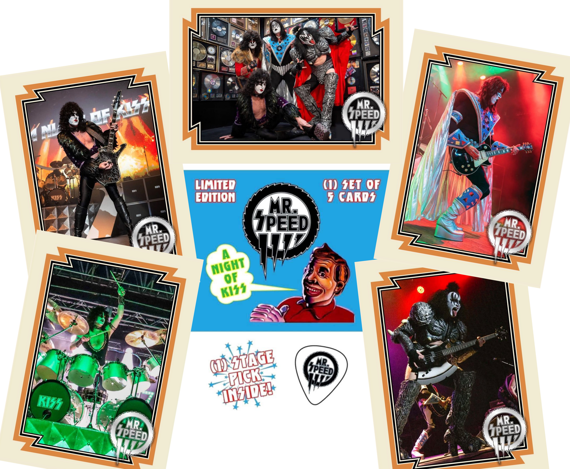 If you’re going to the KISS Cadillac 50th Anniversary Celebration this October 9–12, you’re in for a special treat! MR.SPEED has created a special 5-card set fashioned just like the original KISS cards from back in the 1970s. This is a LIMITED EDITION exclusive offering we'll be selling at the Cadillac celebration for $10 per pack, which includes an official MR.SPEED guitar pick! ONLY 100 packs will be available at the event at this time, and only one pack per fan is allowed.